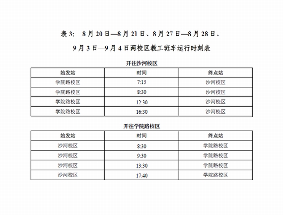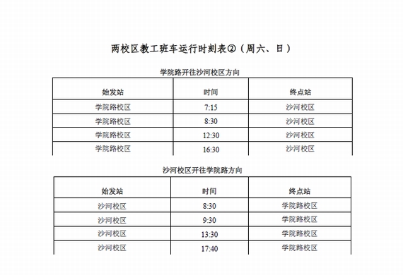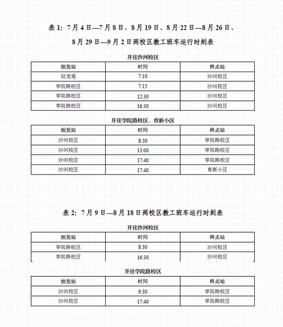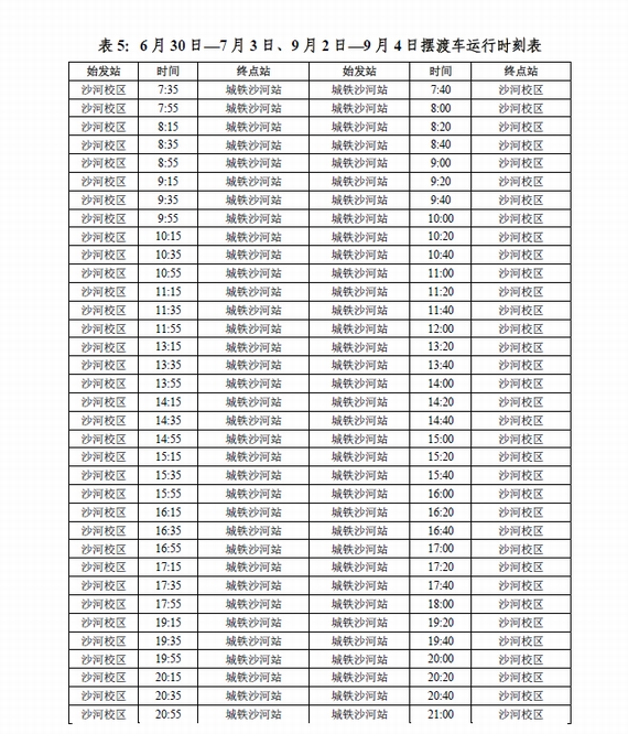 根据学?!豆赜?016年第三学期和暑假安排的通知》,结合沙河校区的工作安排和实际情况,经研究决定沙河校区教职工暑假自2016年7月11日(星期一)至8月18日(星期四)止,8月19日(星期五)正式上班,比学校假期安排提前3天上班。现将2016年暑假期间两校区教工班车及摆渡车运行安排通知如下: