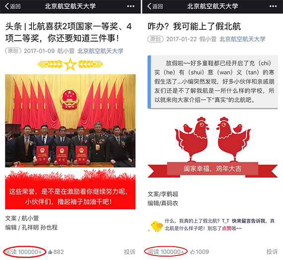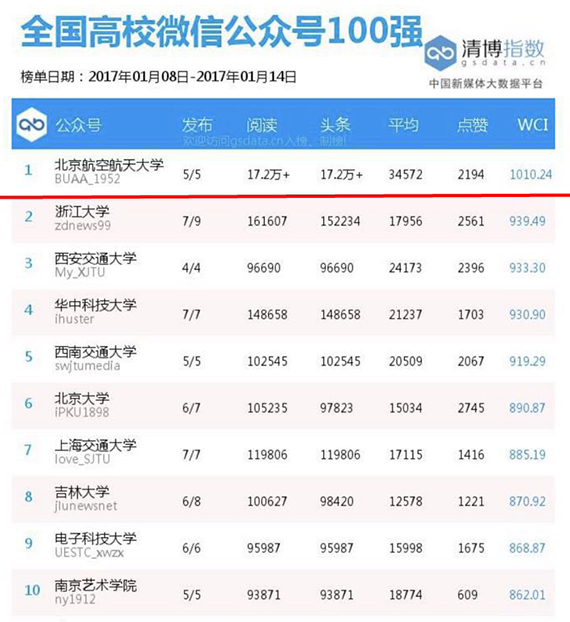 北京航空航天大学官方微信公众平台,推送校园资讯、展示师生风貌、分享科教动态、传播大学文化。投入运营以来,平台等价活跃粉丝数突破14万,WCI(微信传播力)指数突破1000点,微信影响力在全国高校范围内名列前茅。作为官微的运营团队,“航小萱”紧跟时代热点,创造了“头条|北航喜获2项国家一等奖、4项二等奖,你还要知道三件事!”“咋办?我可能上了假北航”两篇10W+及多篇“爆款”推送内容,得到了师生的一致好评。