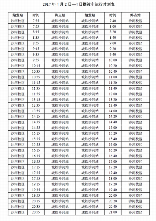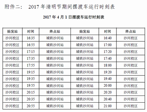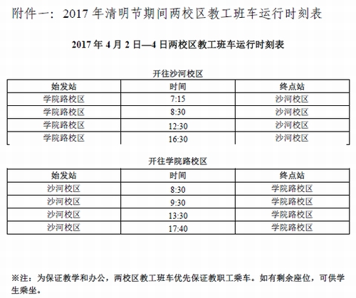 根据学校2017年清明节放假安排:4月1日(星期六)正常上班,两校区教工班车按照正常工作日发车;4月2日(星期日)—4月4日(星期二)放假,两校区教工班车、摆渡车按节假日时间发车。