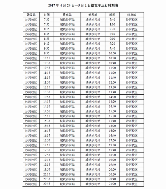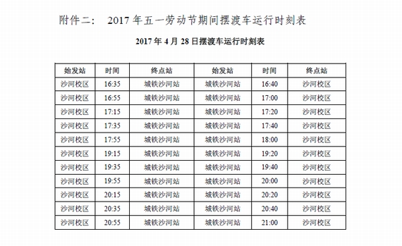附件二:2017年五一劳动节期间摆渡车运行时刻表