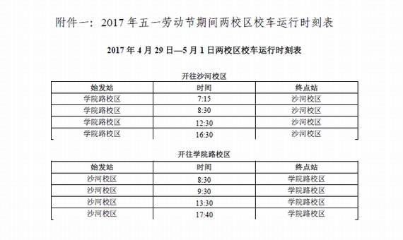 附件一:2017年五一劳动节期间两校区校车运行时刻表
