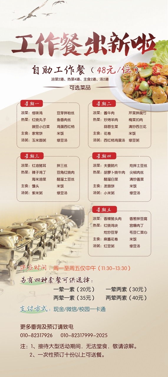 为满足广大师生的就餐需求,培训餐厅在原有工作餐基础上丰富了菜品的搭配,新推出健康美味的小型自助工作餐供大家在午餐时间选择。另外,我们专门为校内师生提供工作餐配送服务,欢迎广大师生光临品尝。