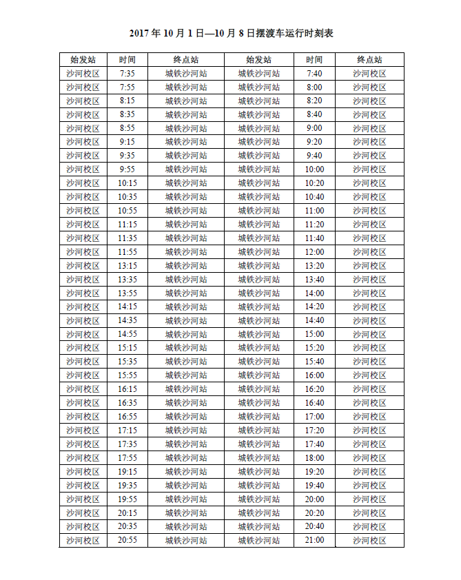 根据学校2017年国庆节放假安排:9月30日(星期六)正常上班,两校区校车按照正常工作日时间发车,摆渡车于下午16:35起开行;10月1日(星期日)—10月8日(星期日)放假,两校区校车、摆渡车按节假日时间发车。
