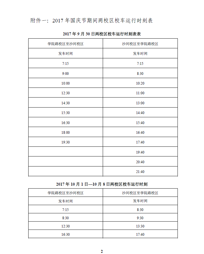 附件一:2017年国庆节期间两校区校车运行时刻表