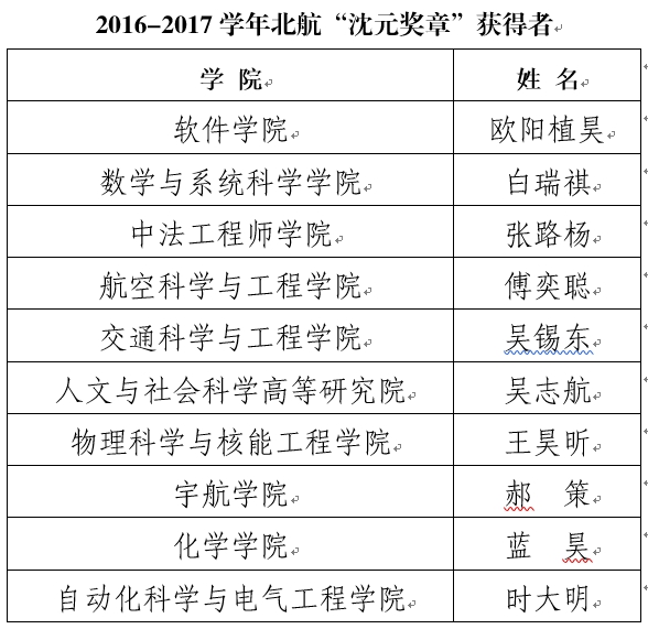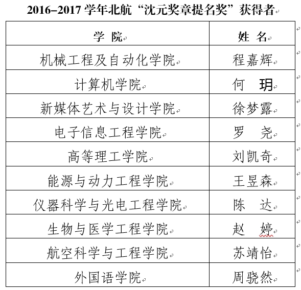 我校2016-2017学年“沈元奖章”评选工作已完成。本次“沈元奖章”评选工作依照“沈元奖章”章程(2017年修订),坚持公平、公正、公开原则,经学院推荐、函评初选、答辩复选等程序共评选出 “沈元奖章”获得者10名,“沈元奖章提名奖”获得者10名,现将获奖名单公示如下: