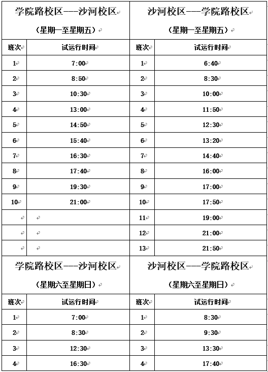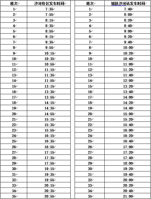 沙河校区摆渡车运行时刻表(试运行)