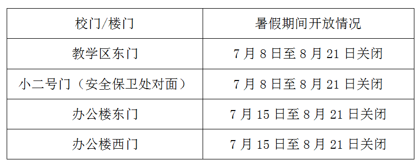 为切实做好暑假期间的校园综合防控,维护校园秩序,在保证学校教学、科研、生产正常运转的前提下,就2019年暑假期间校园各门开放时间做出如下调整: