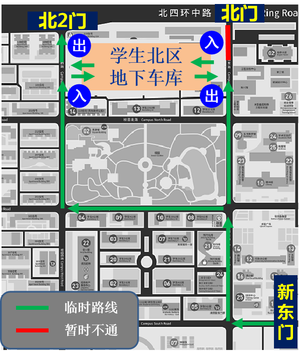 由于校园东路北段(12公寓东南角路口至地库东口)已具备通车条件,为方便车辆进出,自2019年10月25日起,学院路校区学生北区地下车库将调整进出路线。车辆由北区地库东口、西口均可进出停车,同时取消原绕行学生北区内部路线,地库东口至学校北门路段(正在施工)暂时封闭。调整后的地库进出路线具体如下图所示。