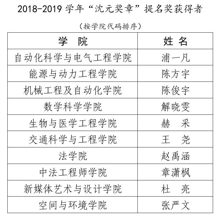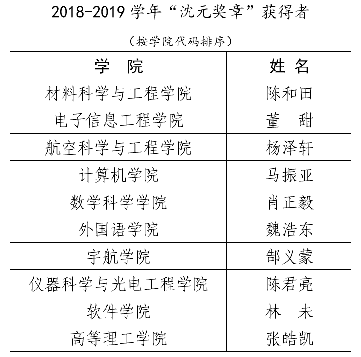 2019年北航“沈元奖章”评选工作顺利完成,校“沈元奖章”评审委员会坚持公开、公平、公正的原则,经过初审函评、终审答辩,共评选出“沈元奖章”获得者10名,“沈元奖章”提名奖获得者10名,现将最终结果公示如下。