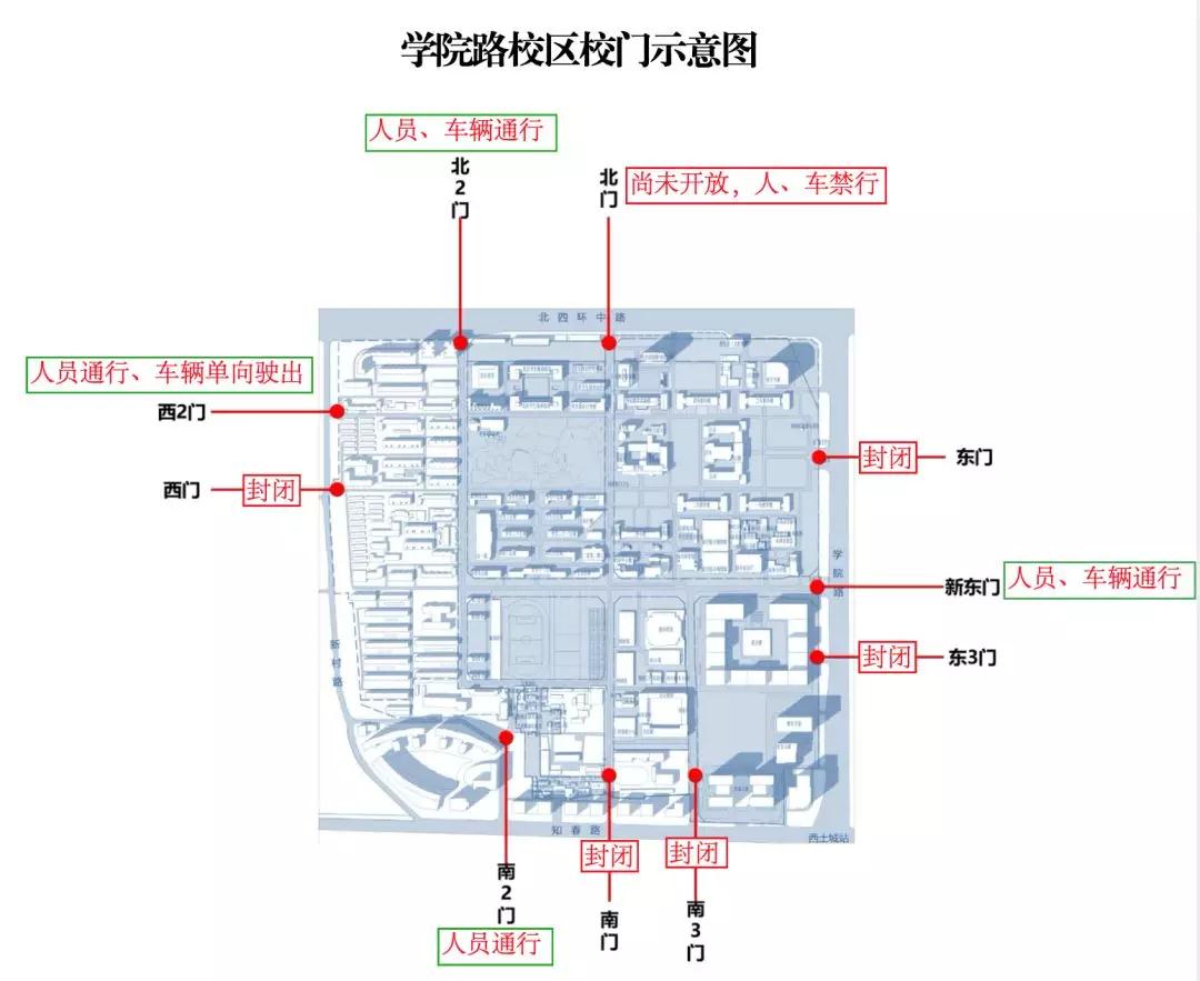 1、自2020年1月28日零时起,学院路校区东门、东3门、南门、南3门、西门暂时封闭,新东门、南2门、西2门、北2门正常通行(详见下表)。进入校园人员和车辆均进行身份审核查验,拒不配合的禁止入校。