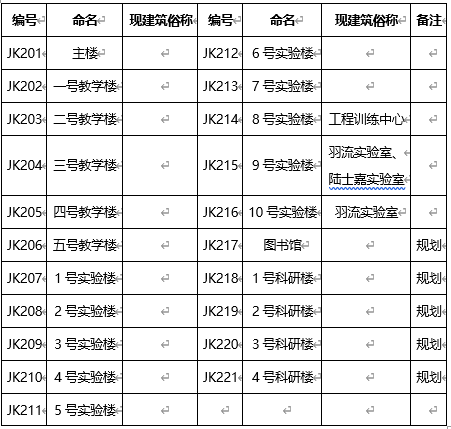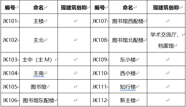 学院路校区其他教学科研办公建筑基础编号以“JK1+序号”标识,命名与现建筑俗称基本一致,具体情况如表3所示,位置如图1所示。