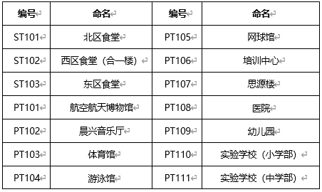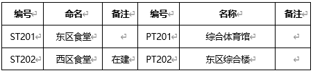 学院路校区配套建筑中食堂基础编号以“ST1+序号”标识,其他配套建筑基础编号以“PT1+序号”标识,具体情况如表6所示,位置如图1所示。