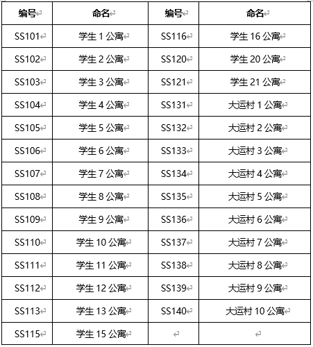 学院路校区学生公寓基础编号以“SS1+现公寓号”标识,基础命名规范为“学生X公寓”、“大运村X公寓”,具体情况如表4所示,位置如图1所示。