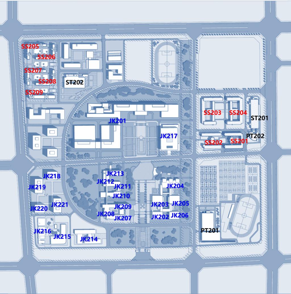 沙河校区教学科研办公建筑以“JK2+序号”标识,具体情况如表7所示,位置如图2所示。