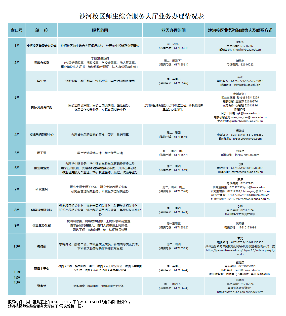 沙河校区师生综合服务大厅各窗口单位均设立沙河校区业务咨询联络专人,将通过线上、线下多渠道服务沙河校区师生业务需求。