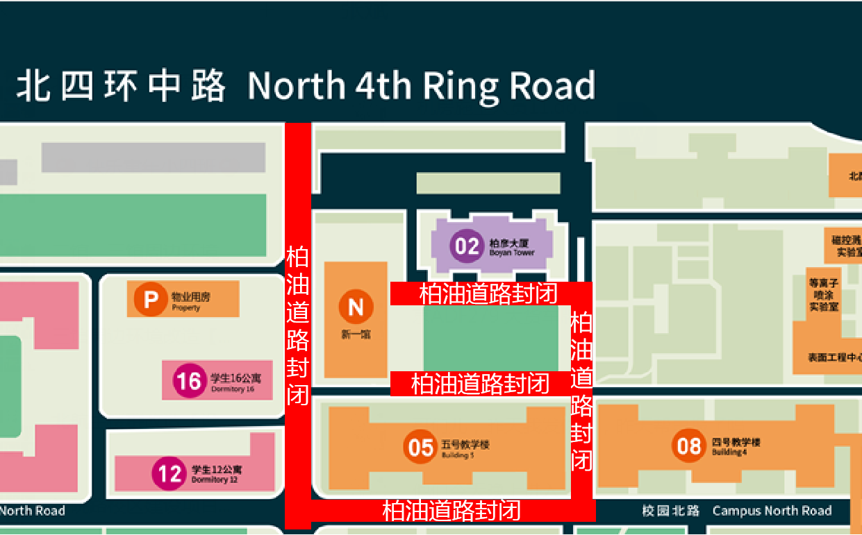 学校将于近期启动五号实验楼周边道路柏油铺设工作,为保障作业期间车辆及行人安全,将于2020年10月17日-10月21日临时封闭校园东路北段、教学区五号实验楼周边部分路段,详细位置如下图所示。封路期间,步行区西北门暂时关闭,师生进入教学区需绕行图书馆南侧。北区地下车库东侧进出通道(位于校园东路北段)将暂停使用,地下车库西侧进出通道(位于校园西路北段)正???,请您提前规划校内交通路线。感谢您对学校工作的支持与配合。