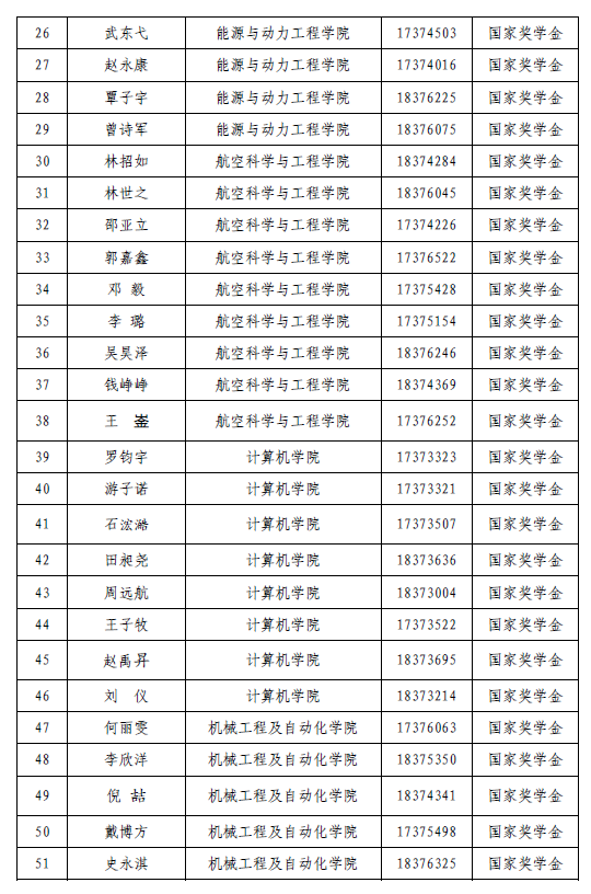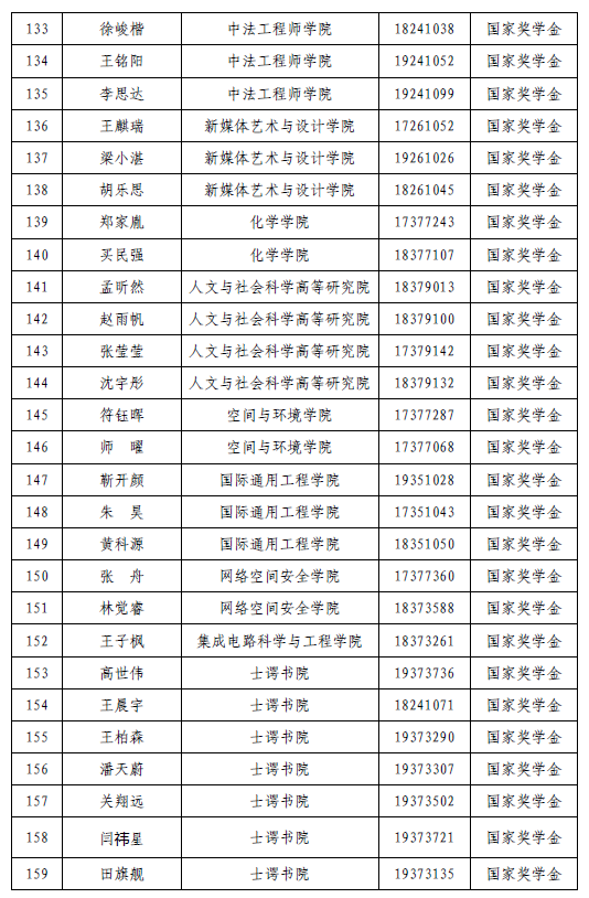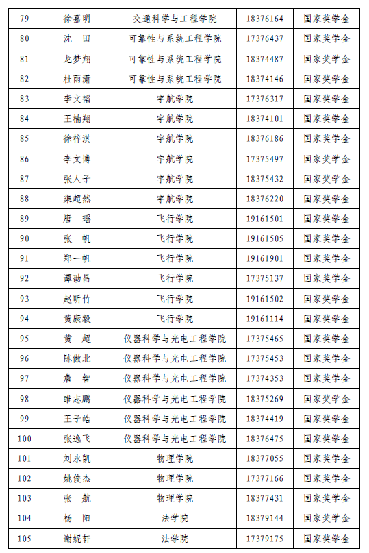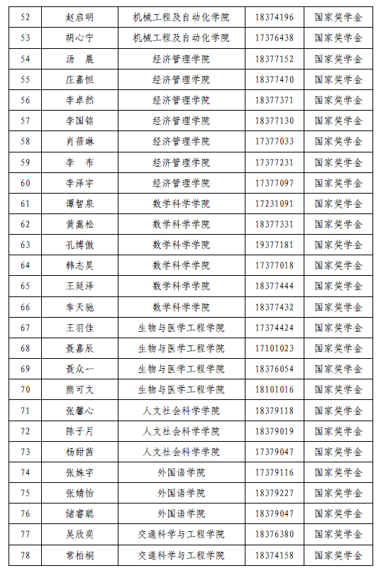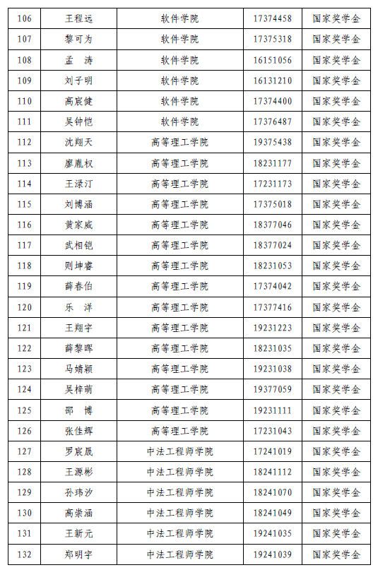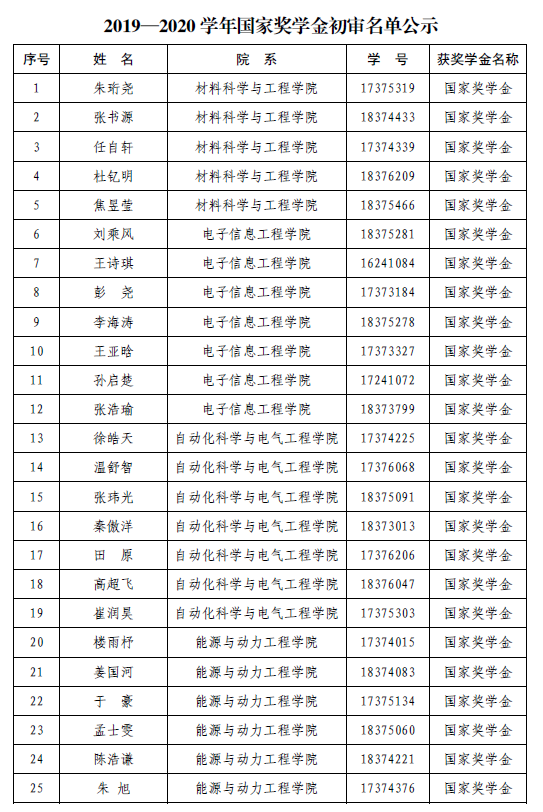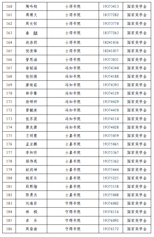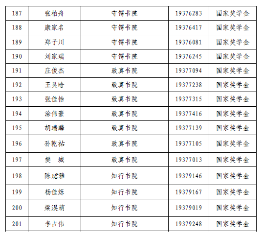 根据教育部、财政部《本专科生国家奖学金评审办法》(教财函[2019]105号),教育部全国学生资助管理中心《关于做好2020年普通高校本专科生国家奖学金工作的通知》(教助中心[2020]67号)相关要求,我校坚持公开、公正、公平原则,严格按照评审程序,认真组织开展2019-2020学年国家奖学金评审工作。经政策宣传、通知发布、学生申请、学院(书院)初审、校学生资助中心复审,总计评选出国家奖学金获奖学生201名,现将评审结果公示如下。