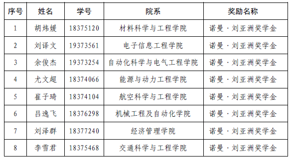 经学生申请、学院推荐、校学生资助中心评审,现评选出以下8名学生作为我校2020年诺曼·刘亚洲奖学金获得者。