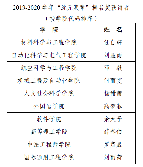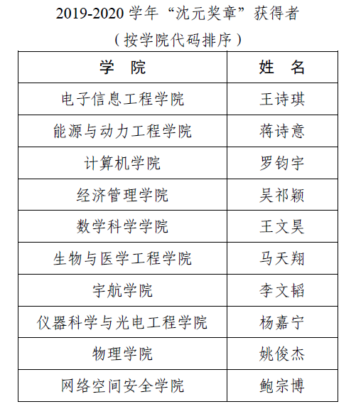 2020年北京航空航天大学“沈元奖章”评审工作顺利完成,?!吧蛟闭隆逼郎笪被峒岢止?、公平、公正的原则,经过学院推荐、初审函评、终审答辩,共评选出“沈元奖章”获得者10名,“沈元奖章”提名奖获得者10名,现将评审结果公示如下。