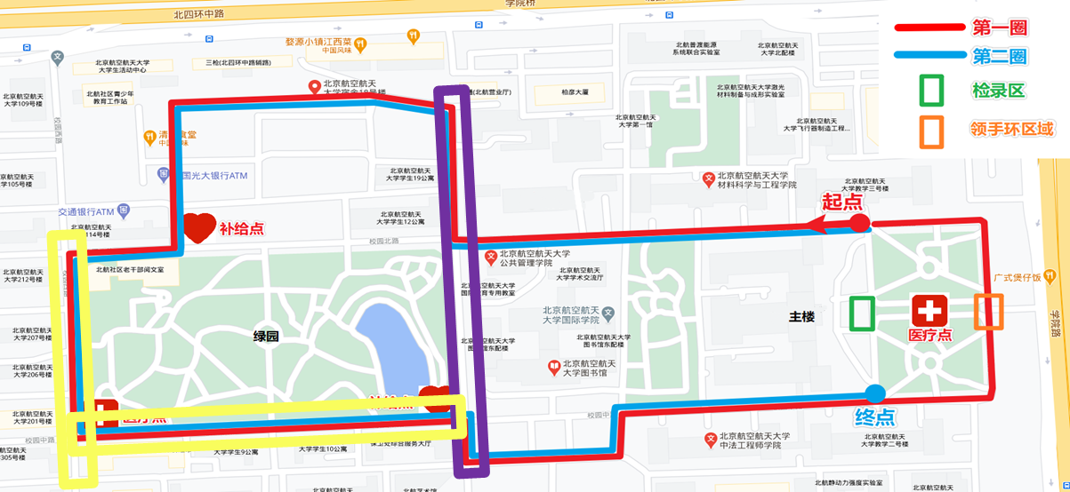 学校计划于12月13日举办第七届 “一二·九” 北航微型马拉松比赛,学院路校区预计将有近千名师生参加。为保障人员安全及比赛顺利进行,拟定于12月13日上午8:00至11:00对相关路段实施临时交通管制,管制区域及路段禁止机动车通行,行人及非机动车途径相关路段请慢行避让,注意安全。具体安排为:(1)8:00-11:00,北区地下车库东侧进出口临时关闭,校园东路北段采取交通管制;(2)9:00-11:00,校园中路(绿园南侧路段)及校园西路(学4楼路口至思源楼路口路段),根据比赛进程采取分时管制。具体比赛路线及交通管制路段如下图所示(紫色框路段,8:00-11:00全时段管制,黄色框路段,9:00-11:00期间分时段管制)。