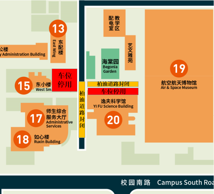 2,自2021年4月1日(星期四)18:00起,东小楼东侧停车位停用,第九馆(逸夫科学馆)北侧、西侧柏油道路封闭,详见下图,恢复使用时间另行通知。