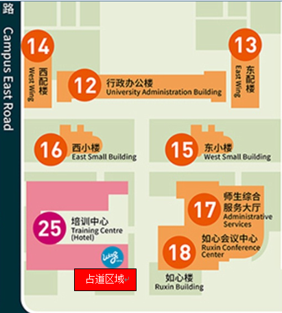 学校将于近期进行后勤培训中心楼体字吊装作业,为保障作业期间车辆及行人安全,同时确保施工顺利进行,将于2021年5月16日(星期日)8:00至14:00临时占用培训中心南侧部分人行步道路段,详细位置如下图所示。