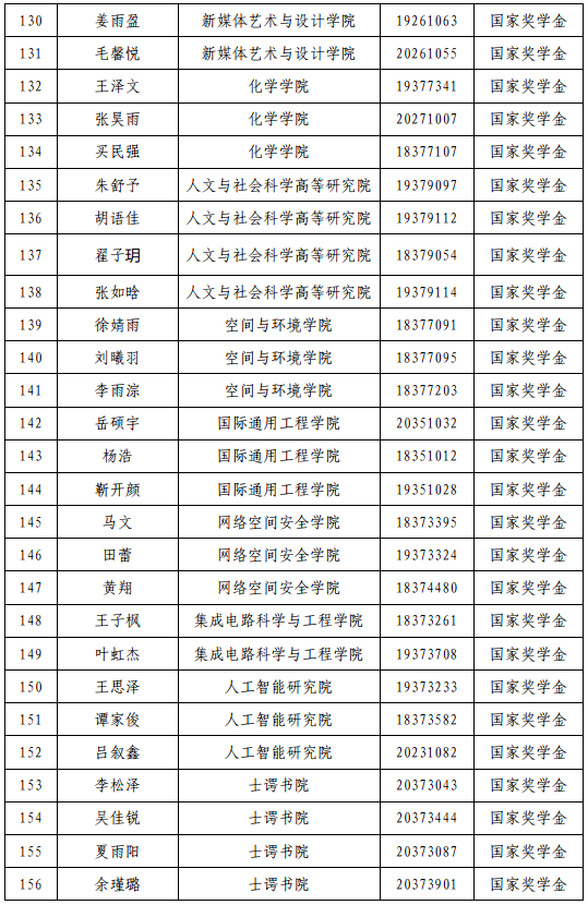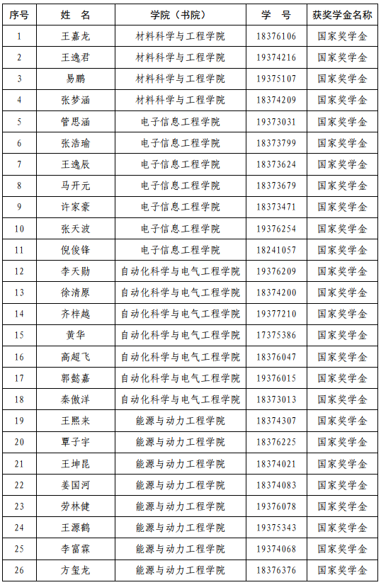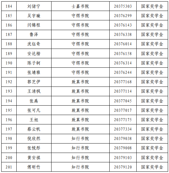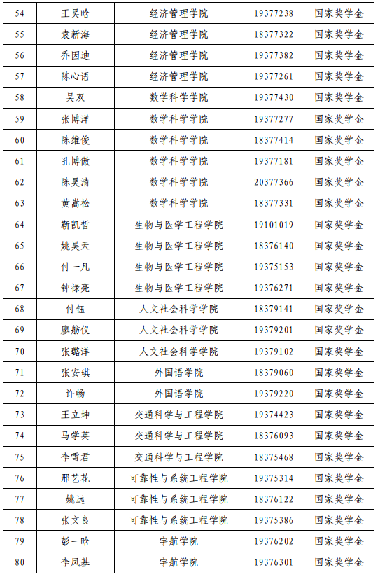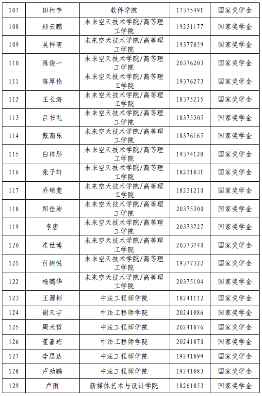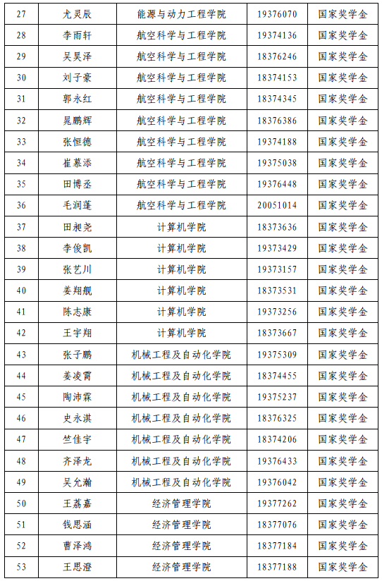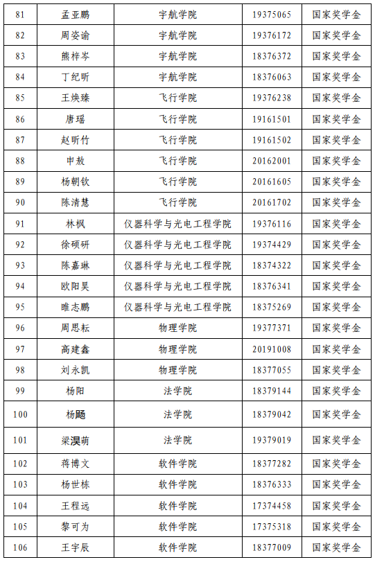 根据教育部、财政部、人力资源和社会保障部、退役军人部和中央军委国防动员部《学生资助资金管理办法》(财科教〔2019〕19号)和教育部全国学生资助管理中心《关于做好2021年普通高校本专科生国家奖学金工作的通知》(教助中心〔2021〕55号)的相关要求,我校坚持公开、公正、公平的原则,严格遵照《北京航空航天大学国家奖学金章程》,按照奖学金评审工作程序,认真组织开展2020-2021学年国家奖学金评审工作。经政策宣传、通知发布、学生申请、学院(书院)初审、校学生资助中心复审,共评选出国家奖学金获奖学生201名,现将结果公示如下。