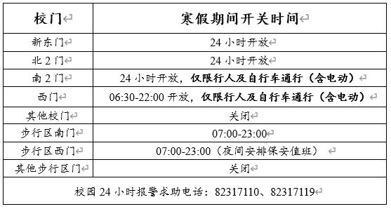 为做好2022年寒假期间校门管理和疫情防控工作,经学校研究决定,自2022年1月24日起至2月20日止,学院路校区各校门及步行区各门开关时间调整如下: