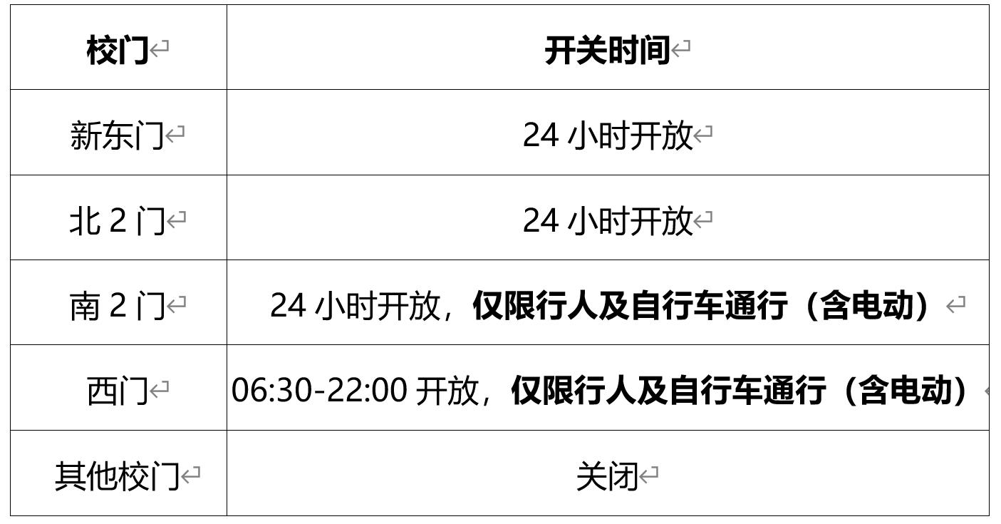 为进一步加强校门管理,切实做好疫情防控工作,经学校研究决定,自2022年5月6日起关闭北门、南门、南3门,调整后的校门开关时间如下: