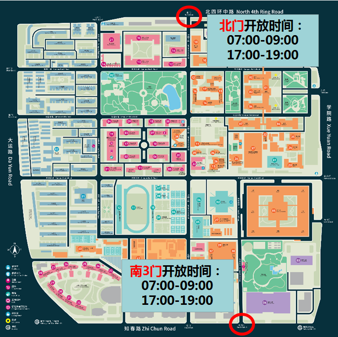 根据北京市疫情防控最新形势,为统筹推进学校疫情防控及事业发展,在加强校门管控的同时,兼顾师生的出行需求,学校将于2022年6月29日起,在高峰期开放学院路校区北门、南3门,具体如下: