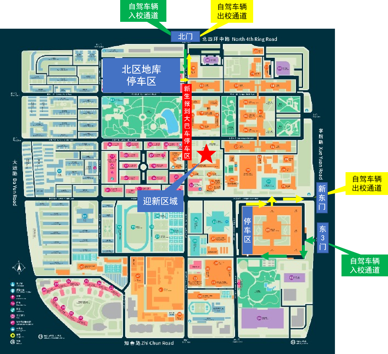 3、教职工车辆如需由东3门(新生报到专用门)入校,直接进入新主楼地库(东库)停放;如需由北门入校,直接进入北区地库停放。其他各门仍可正常通行。