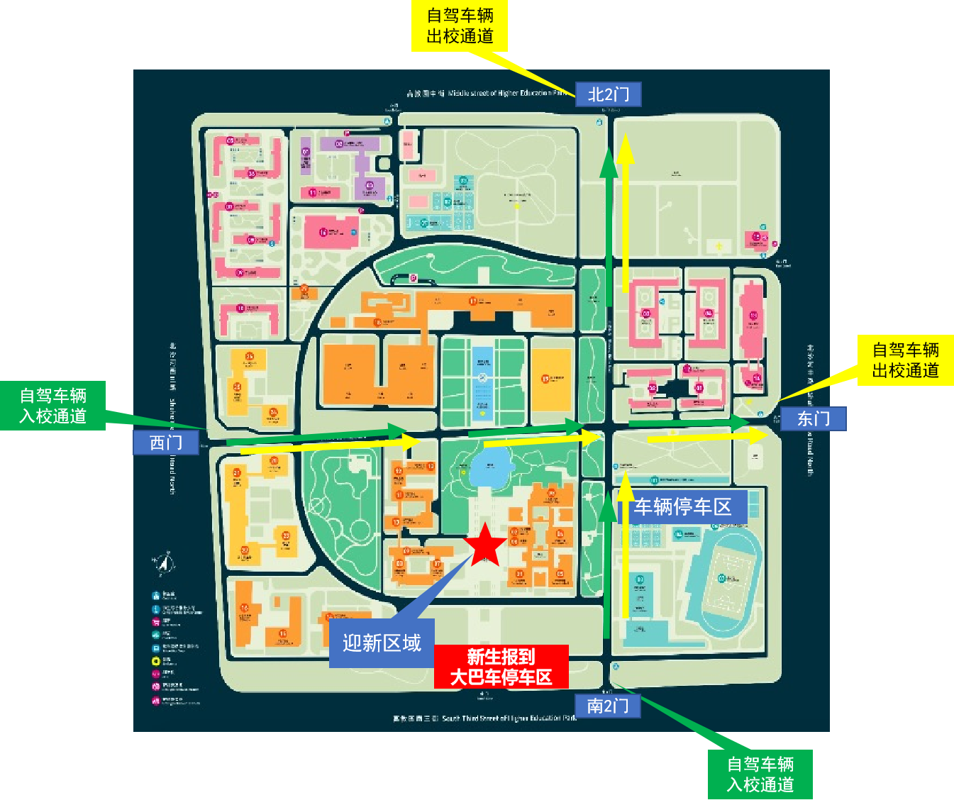 2、新生报到自驾车辆由南2门或西门入校,由北2门或东门出校。除南2门附近指定停车区域外,指定路线沿线路侧均可临时停车,请配合现场人员指挥。