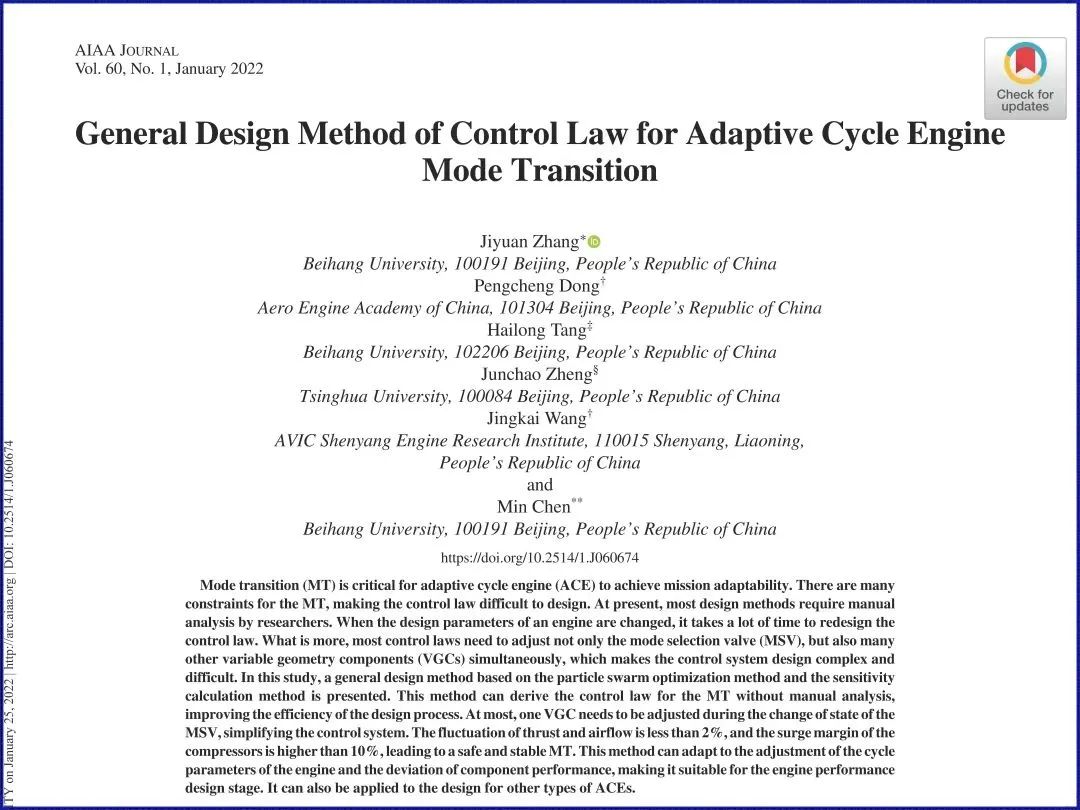 于是,他果断推倒已有研究成果,开始从应用角度重新思考。当时正值新冠疫情暴发,居家的他丝毫没有懈怠,每天工作超过10小时。为了便于工程使用,他在优化工况性能的过程中,还兼顾方案的可行性。经过1个多月的文献调研、结果优化,他终于找到了关乎设计成败的临界点机理特征。随后,他利用简化为单调线性的规律,维持了约90%的性能优势,并将算法赋予可自动适应设计参数变化的功能。这项发表于航空领域知名期刊《AIAA Journal》的研究成果,比GE Aviation公司公布的结果更加简单易行,受到了国际同行们的认可。