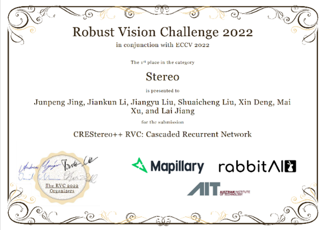 他积极参加学术交流,担任计算机视觉顶会审稿人,服务学术社区。他热衷于参加学术竞赛,与国内外高水平团队切磋技术,在国际高水平会议IEEE European Conference on Computer Vision举办的鲁棒视觉公开挑战赛(Robust Vision Challenge)上,以第一作者身份带领团队参加了立体视觉赛道的比赛,并提出了基于级联式递归网络的实用性立体匹配算法,在3个公开基准共计46项指标中实现了39项指标领先,最终获得比赛冠军,并做口头报告分享方案。