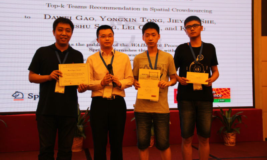 童咏昕(左一)与指导本科生获大数据领域重要会议WAIM 2016最佳论文