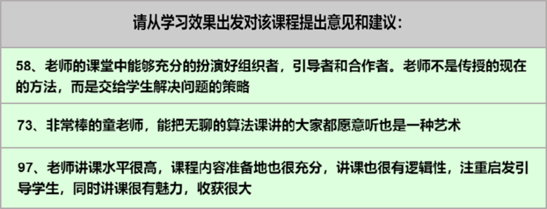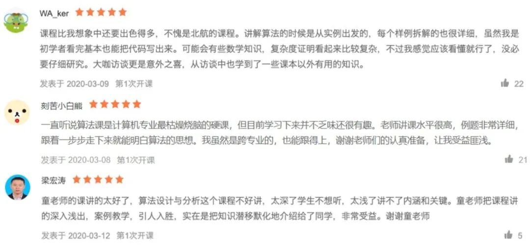 课程在多个平台上线后,得到听课师生的广泛好评。有学生评价课程:“把无聊的算法课讲得大家都愿听也是艺术”、“感受到算法在现实生活中的重要价值”;也有来自兄弟院校的老师们评价:“童老师把课程讲得深入浅出,案例教学,引人入胜”。
