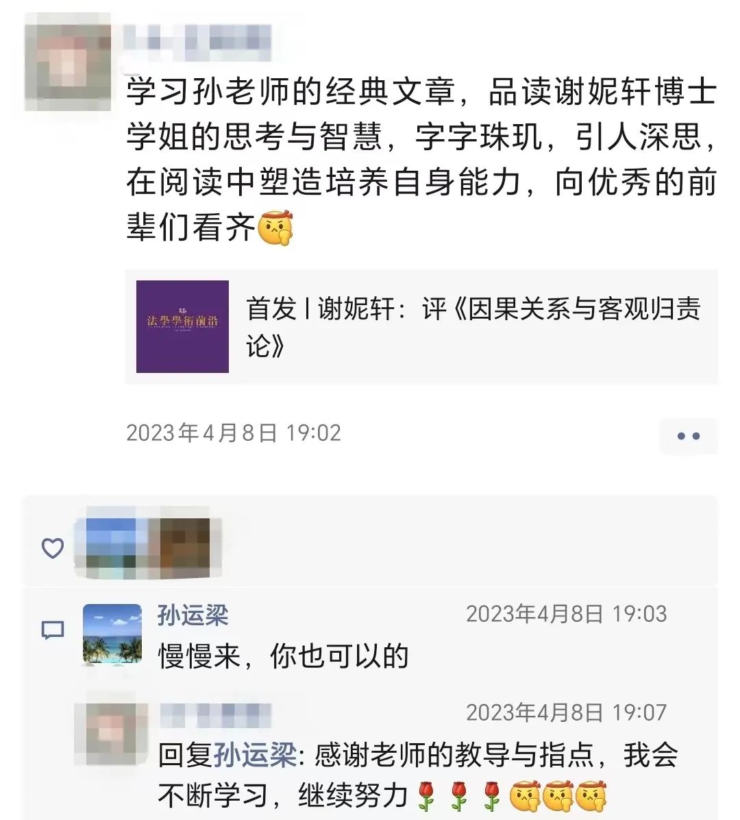 在清晰授课、深入浅出的另一面,是孙运梁对学术、对教学精益求精的极高追求。每周3学时的课程背后,都有一份不少于2万字的、条理清晰而又逻辑严明的授课教案。每次课程结束,孙运梁都会在课程微信群中分享与课程有关的文章,帮助同学们复习课上内容,同时向大家介绍古今中外的优秀刑法学者及其著作。这极大开拓了同学们的眼界。有一位同学说:“孙运梁老师带给我们的,除了知识、方法、思维……还有他本人对法学始终不变的热爱与追求。”这份最持久的热爱,最热切的追求,无时无刻不令同学们感动,又激励大家奋进。