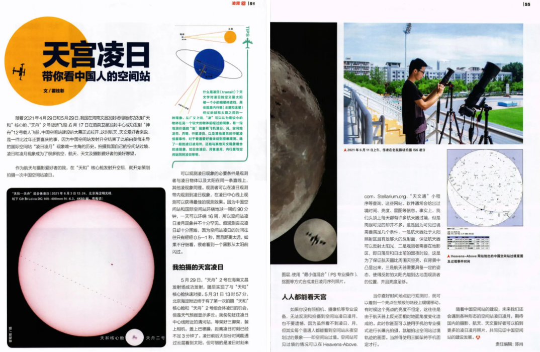 他撰写的科普文章“天宫凌日,带你看中国人的空间站”发表在《航空知识》杂志2021年8月刊,被“中国的航天”公众号转载。