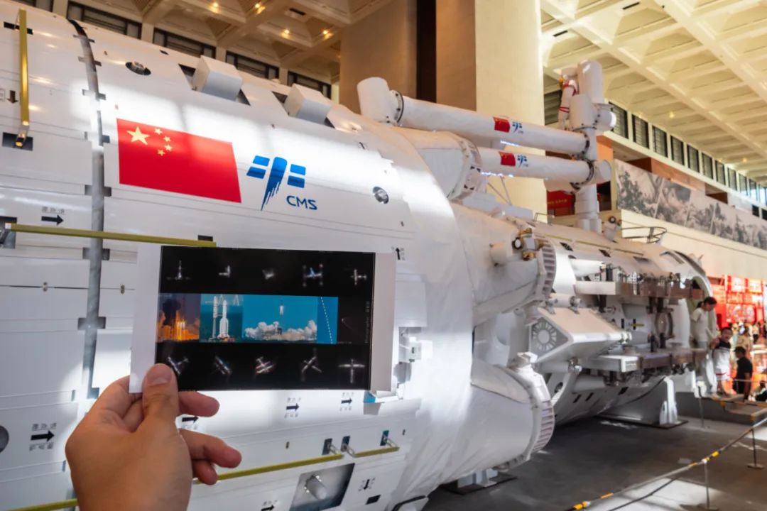 参观中国载人航天工程30年成就展,作品与天和核心舱模型合影