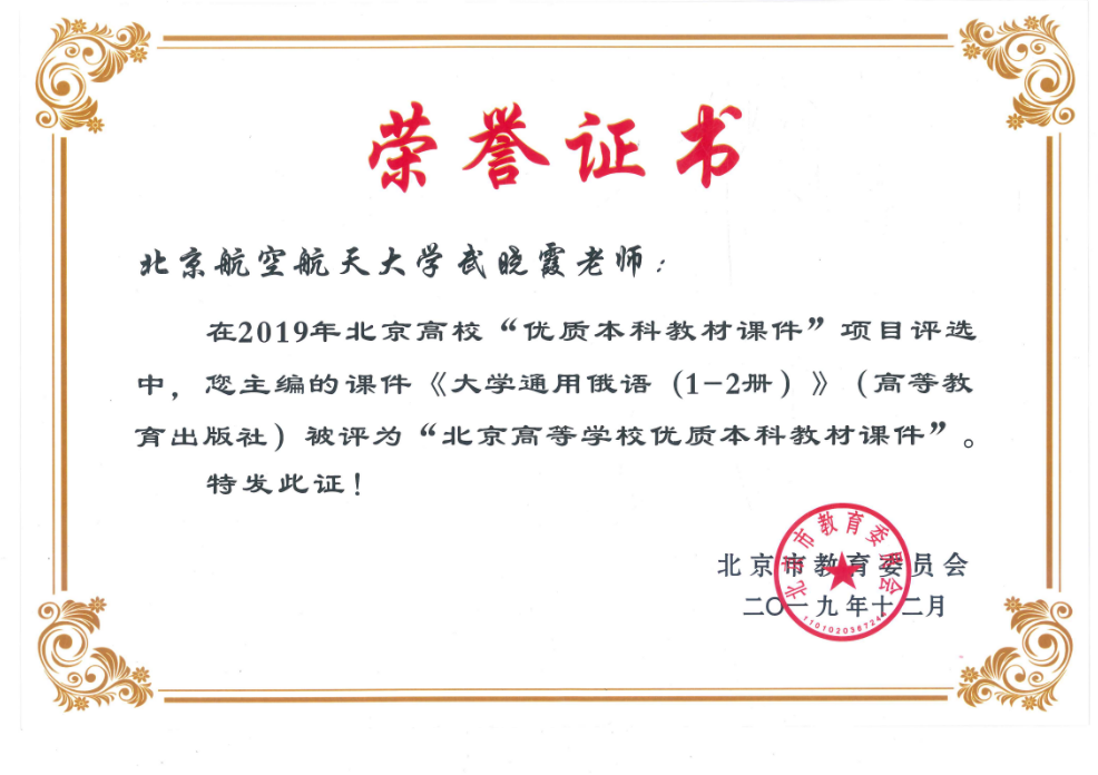 武晓霞老师的卓越能力还体现在她带领团队出品的《大学通用俄语(1-2)》教材。这部教材的编写历时10年,融合了纸质教材、多媒体课件、慕课、数字课程、背单词APP等多种现代教育手段,是国内首部新形态立体化教材。在北航,该教材每年使用人数超过300人。多名赴俄留学交流的学生反映,北航的俄语教学内容和方法都非常实用,他们出国后很快就能适应具体语境的应变,并顺利通过专业考试和学位答辩。