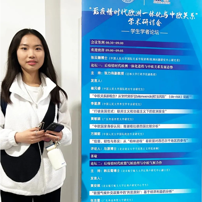 ——关于气候正义、发展中国家的发展权利与全球治理格局,她独立撰写《欧盟气候外交政策中的“共区原则”:基于经济利益的分析》,文章收录于中国社会科学出版社《全球气候变化与中欧合作》论文集,在中国人民大学举办的“后疫情时代欧洲一体化与中欧关系”学术研讨会上做成果汇报。