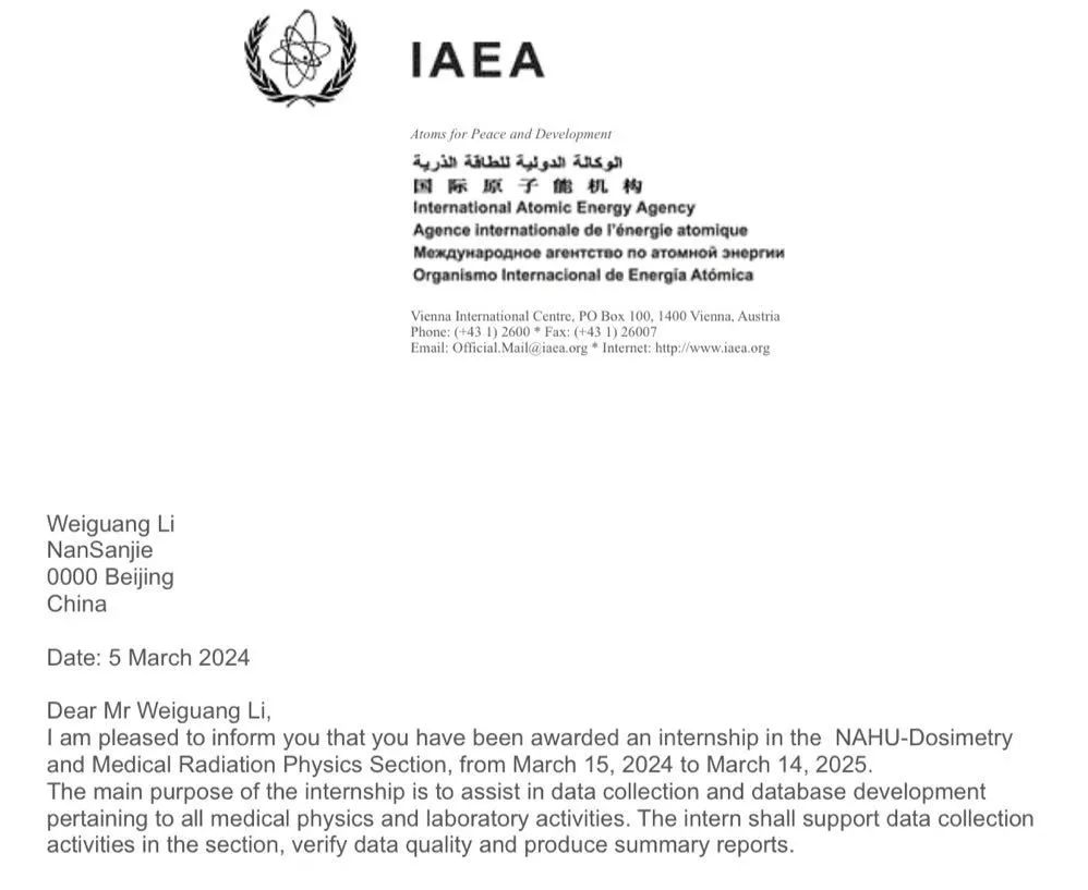 2024年初,李伟光经由导师与学校推荐和国家原子能机构筛选,被国际原子能机构录用,前往奥地利维也纳进行为期一年的实习。